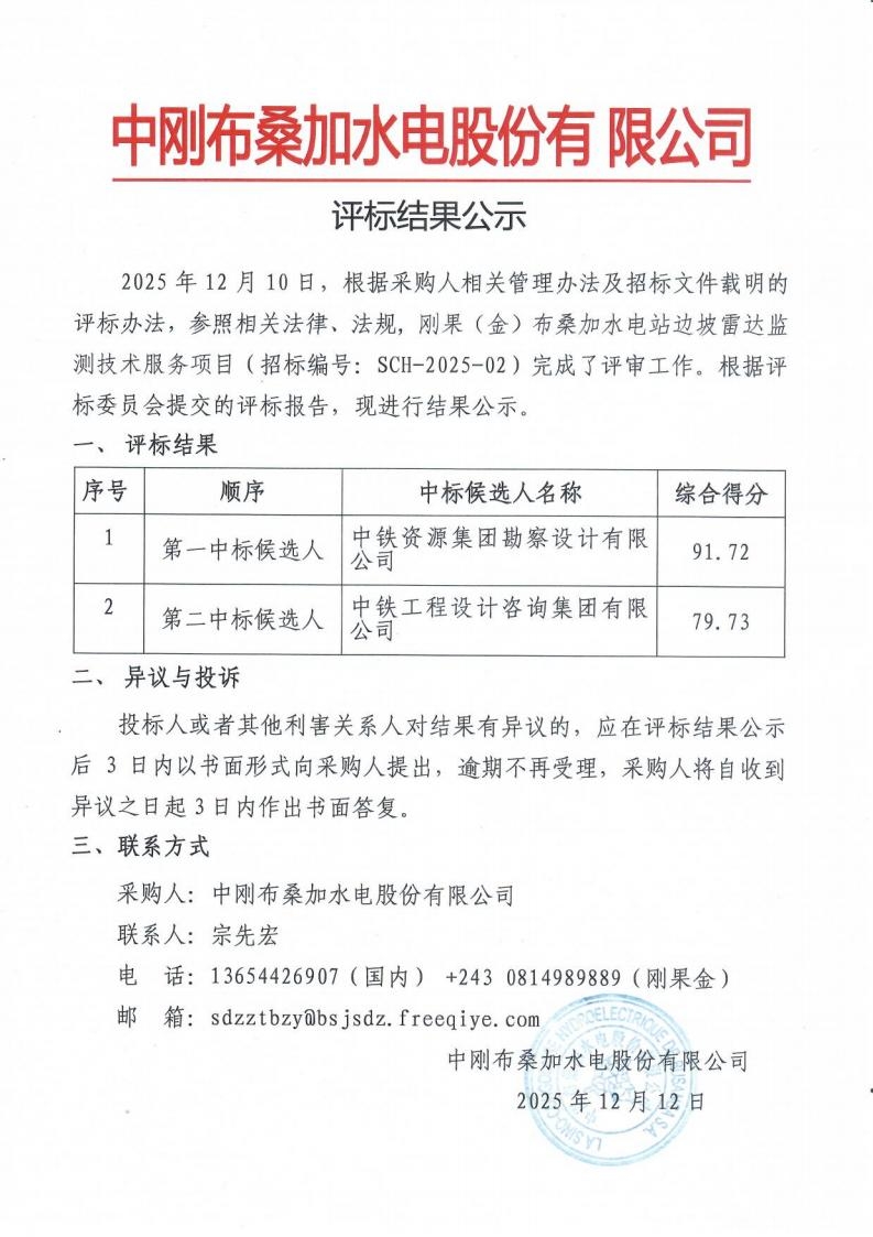 刚果(金)布桑加水电站边坡雷达监测技术服务项目评标结果公示